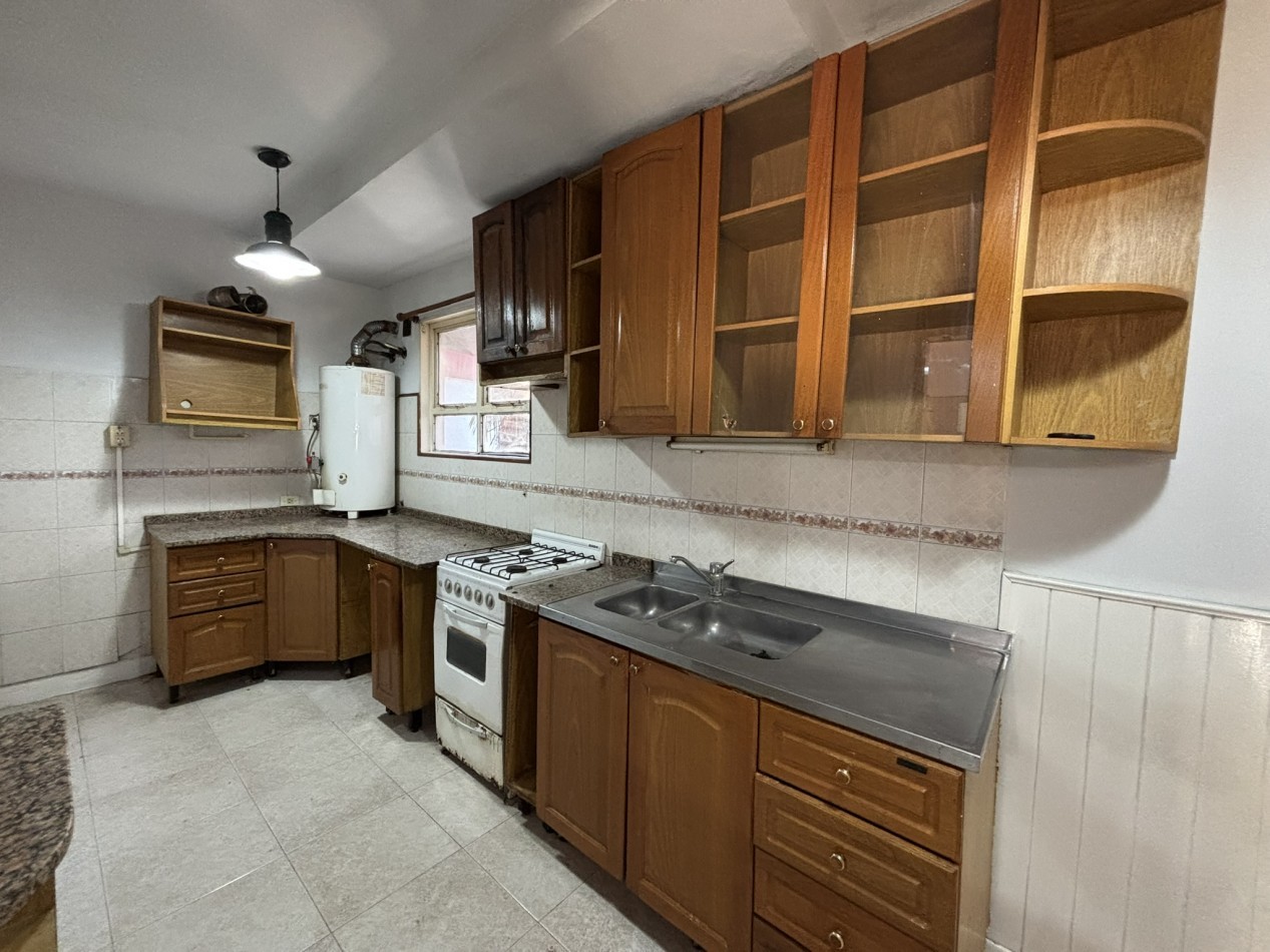 La cocina es amplia, con muebles bajo mesada, alacena y barra desayunadora, práctica tanto para el uso diario como para compartir. El baño es completo y está instalado.