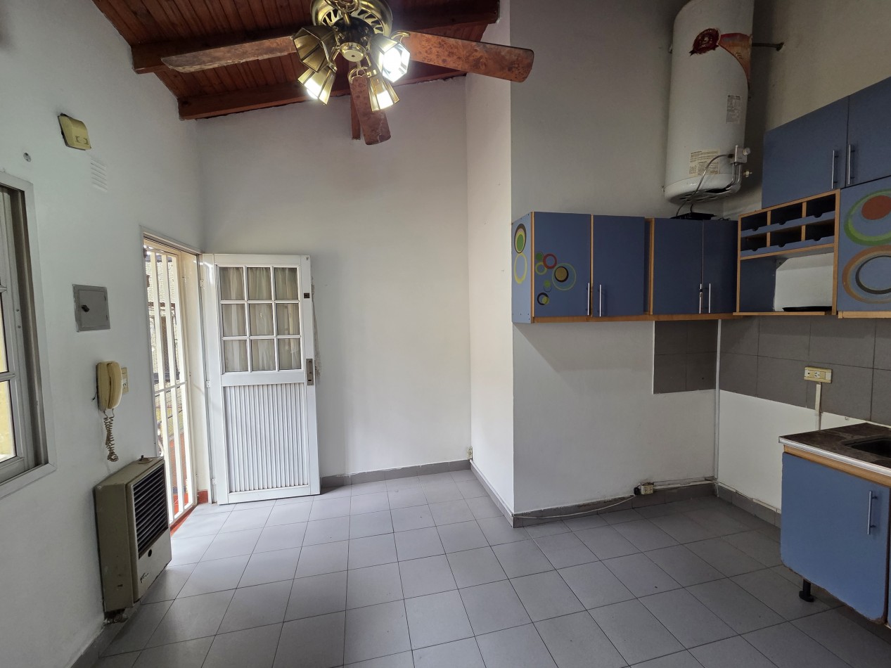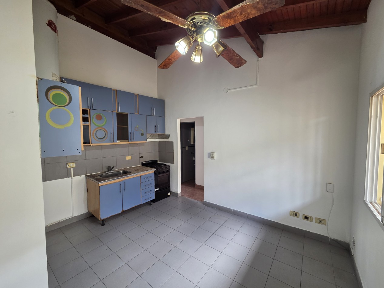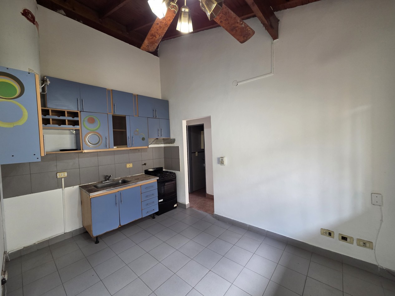 La unidad cuenta con un amplio y luminoso living comedor, con techos altos de madera a la vista que brindan una sensación de calidez y amplitud única. La cocina integrada se encuentra totalmente amueblada, con buen espacio de guardado y conexión para lavarropas, ideal para el día a día.